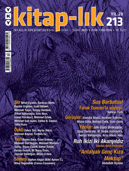 Yapı Kredi Yayınları tarafından yayımlanmakta olan kitap-lık dergisinin 213. sayısının dosya konusu Faruk Duman'ın “Sus Barbatus!” romanı. İki cildi yayımlanan üçlemenin geçtiğimiz yıl çıkan ikinci cildi üzerinde duran yazarlar, romanın edebiyatımıza getirdiği yeni solukları anlatıyor. Serkan Türk'ün Faruk Duman söyleşisiyle başlayan dosya, Erendiz Atasü, İbrahim Yıldırım, Münir Göle, Behçet Çelik ve İnan Çetin'in genel görüşleriyle çerçeveleniyor. “Sus Barbatus!” romanını makaleleriyle Jale Özata Dirlikyapan, Oğuz Demiralp, M. Sadık Aslankara, Bengü Vahapoğlu, Arzu Alkan Ateş inceliyor.